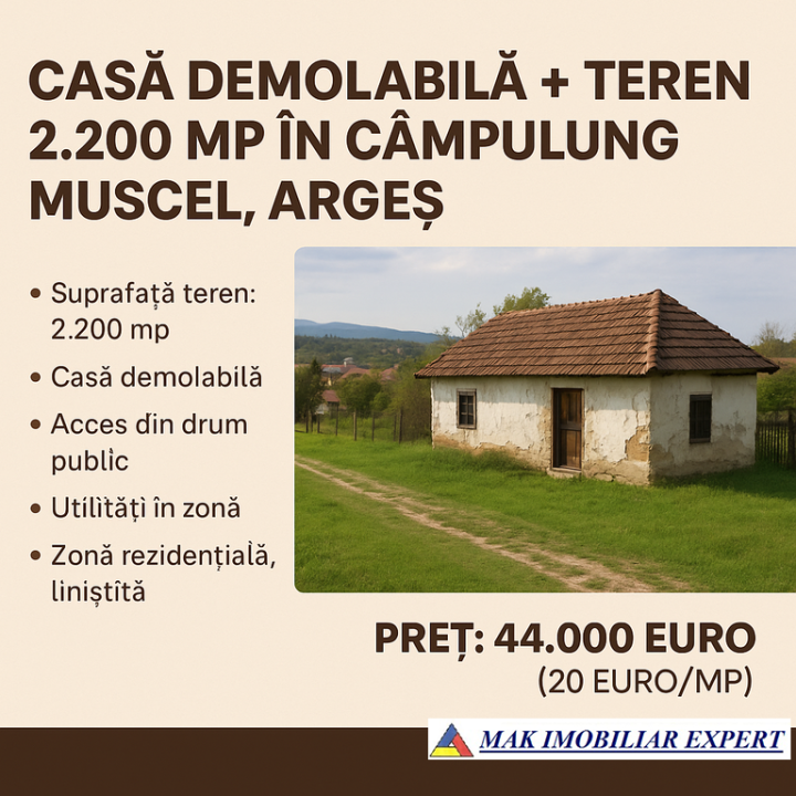De vânzare casă demolabilă cu teren de 2.200 mp, situată în Câmpulung Muscel, județul Argeș — o locație excelentă pentru construirea unei locuințe noi sau pentru investiție imobiliară.