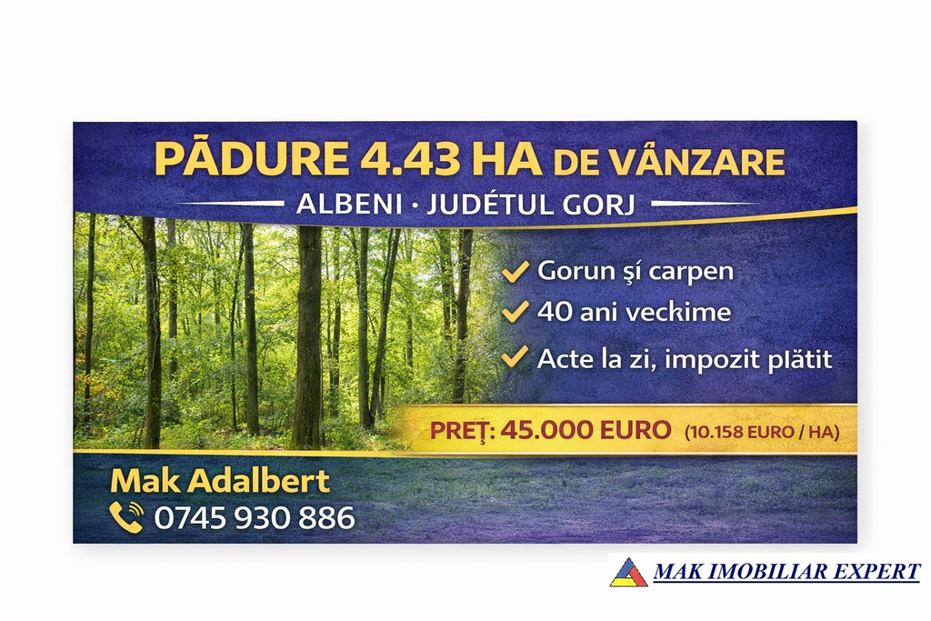 Padure 4.43 ha in Albeni Gorj, gorun si carpen, 40 ani, acte la zi, cadastru si intabulare. Pret avantajos.
