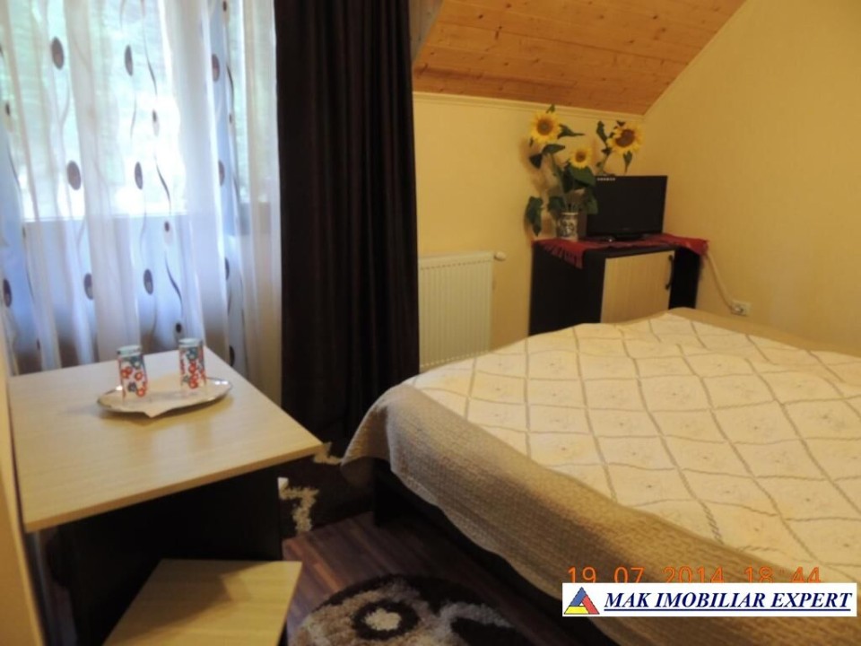 - Vand afacere la cheie, Fiecare dintre cele 2 vile are in componenta sa cate 9 camere duble dotate cu televizor, grup sanitar propriu si balcon, avand la parter cate o bucatarie modern utilata si living unde se pot organiza traininguri si se poate lua masa. De asemenea, in mansarda mai sunt cate trei camere cu baie si balcon. In total cele doua pensiuni au 24 de camere. Exista gaze, lumina electrica, canalizare si 4 surse de apa.