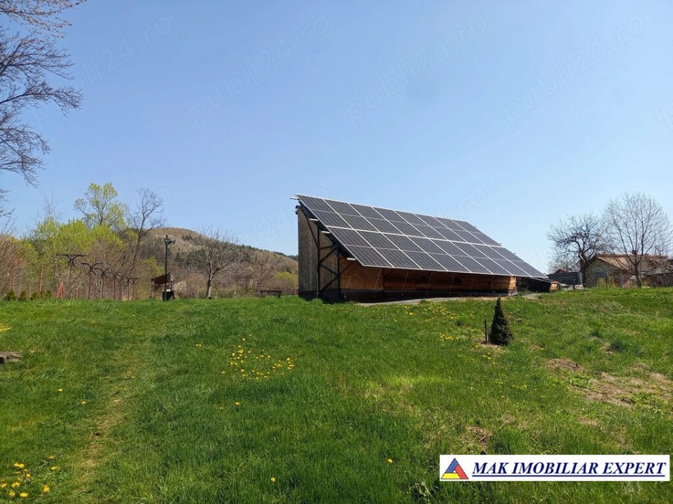 Vand casa cu teren In Bughea de Sus. Suprafata casa 92 mp construit. Suprafata teren 3103 mp + curte comuna 257 mp (depozit comun 33 mp). Casa este din caramida si piatra sculptata cu posibilitati de extindere (mansardare). Utilitati complete: apa, canalizare, curent electric, internet, cablu, supraveghere video. Sistem de incalzire centralizat -termosemineu 45 kw si calorifere (deserveste si apa calda pentru boiler in timpul folosirii). Panouri solare aprox 9 kw montate pe structura metalica detasata de casa (in gradina pentru eficienta maxima la insorire) cu depozitare sub structura. Termoizolatie sub pardoseala 10 cm polistiren extrudat. Termoizolatie exterioara 10-20 cm (exceptie un perete inca netermoizolat). Foarte eficienta termic. Spatiu depozitare lemne. Curent electric tras inclusiv in gradina. Gard complet pe intreg perimetrul proprietatii (stalpi metalici si plasa tesuta) Livada cu pomi si arbusti. Tuja si arbusti ornamentali pe limita de proprietate. Fantana comuna in curte cu pompa apa electrica. Distanta pana in Campulung aprox. 10 minute (pe jos) si 1-3 min cu masina.