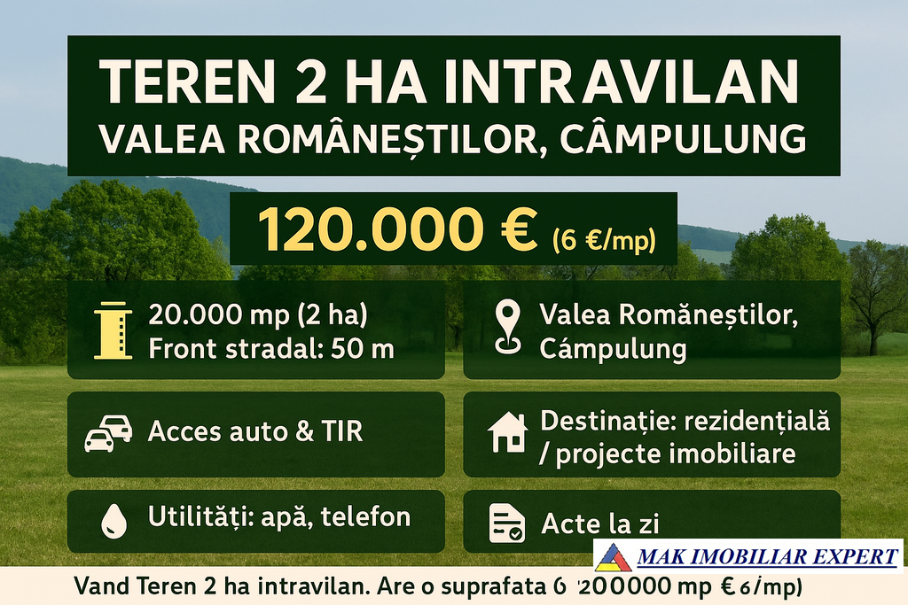 Acest teren intravilan de 2 hectare (20,000 mp), situat în Valea Româneștilor, Câmpulung Muscel, Argeș, oferă o oportunitate excepțională pentru dezvoltare rezidențială sau investiție pe termen lung. Amplasat într-o zonă liniștită și naturală, terenul este ideal pentru construcții rezidențiale de amploare, case de vacanță sau alte proiecte imobiliare. Caracteristicile principale ale acestui teren includ: