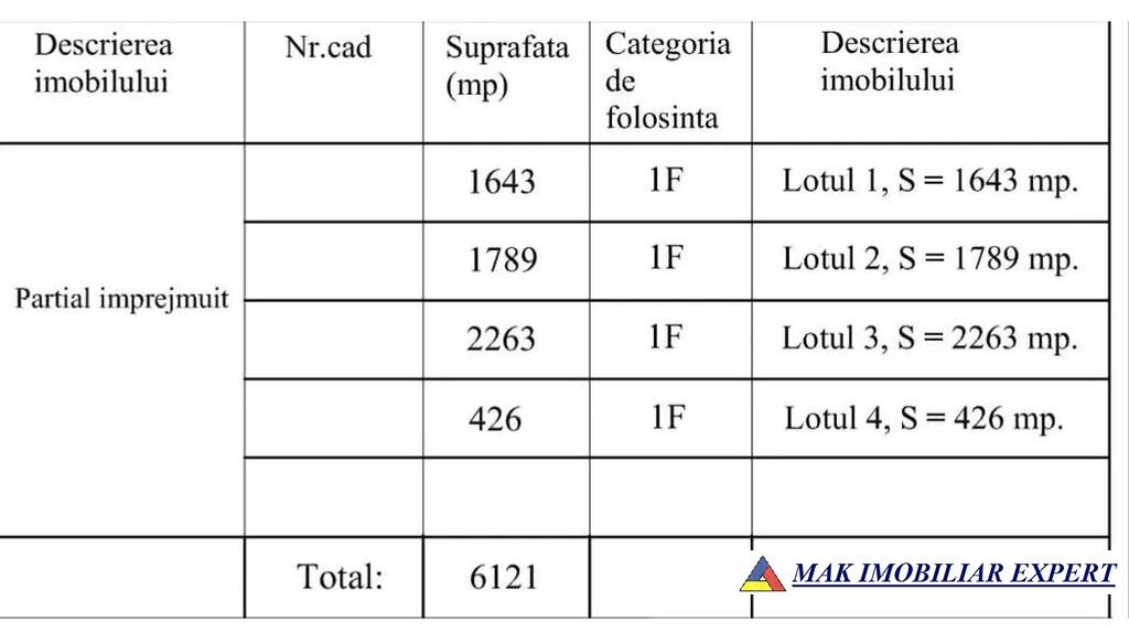 Nota: Parcelat, in 3 (trei) parcele de: